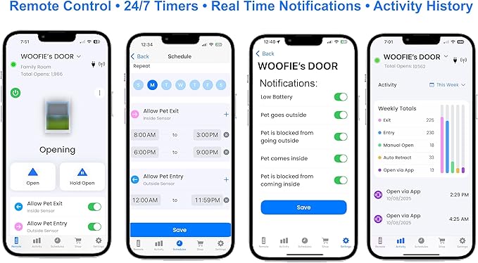 - WI-FI APP FEATURES: Remote Control from Anywhere - 24/7 Weekly Timers, Create Custom Schedules with Individual Entry and Exit Times for Each Day of the Week - Activity History, Monitor Your Pet's Comings and Goings - Real Time Notifications
