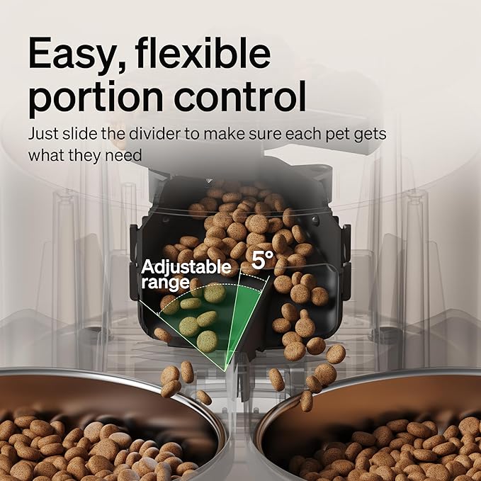 - TWO CATS FRIENDLY DESIGN: PETLIBRO wifi automatic cat feeder is designed for two-cat families. Dry food is evenly distributed to two bowls to avoid competition for food grabbing. 5L large capacity to meet the diverse needs of cats and dogs. Up to 10 meals can be preset per day, and the amount of each meal can be freely adjusted (1-50 portions).