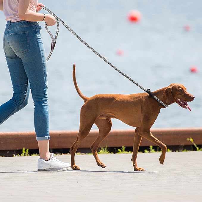 - 【Reflective for Night Safety】This slip training leash has a night safe strands with full threads at all dog leash make your dog visible at night. This heavy duty dog leash is also made of 3/8 inch diameter ultra-durable and wear-resistant rock climbing rope which is reinforced with durable woven design.Ensure the safety of your fur baby.