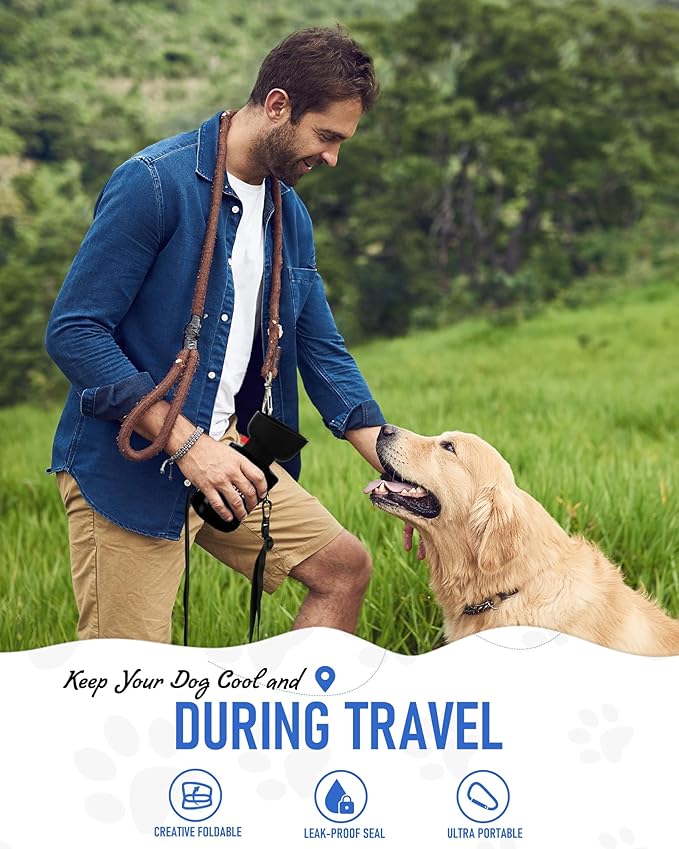 - Portable Dog Water Bottle: equipped with a extension strap, easy to carry. dog bottle water dispenser also comes with an extra carabiner that can be attached anywhere you need it. This travel dog water bowl bottle can add ice water or warm water, provide pets with the appropriate temperature of water, more attention to the health of pets