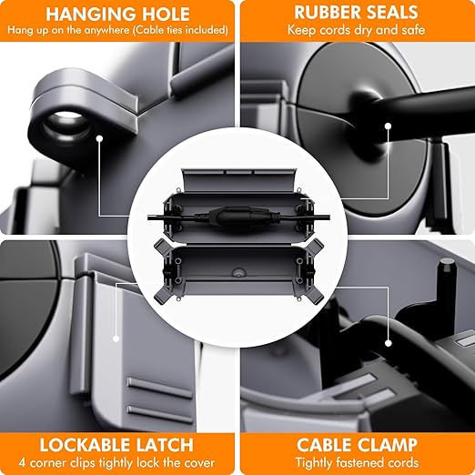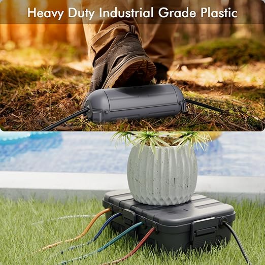 - HEAVY DUTY & WEATHERPROOF: Constructed with industrial grade material, highly durable and UV resistant, great to use in outdoor harsh environment and resist water, snow, rain, dust, dirt. Ideal to protect outdoor extension cord, LED string light, landscape lighting, pool pump, garden power tool, fountain, Christmas and other holiday decorations.