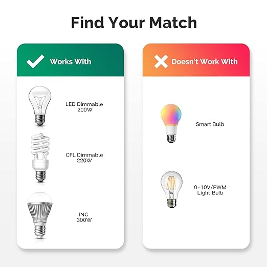 - 5【Widely Used & Note】Works with dimmable LED, dimmable CFL, INC and fan. Through the dimmer plug, you can not only control the table lamps and floor lamps but also Christmas lights. Note: Its load power must be less than 200W. 2.4G WiFi only for the network connection