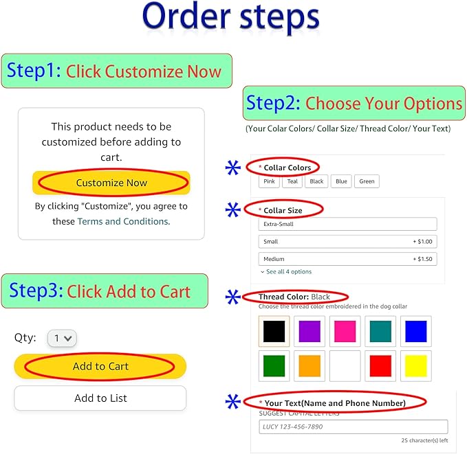 - To order click customize now and enter: (1) COLLAR COLOR: Pink, Teal, Black, Blue, or Green; (2) THREAD COLOR: Orange,White, Black, Navy blue, Pink, blue, Purple, red, Teal,Yellow,Green; (3) COLLAR SIZE: X-Small, Small, Medium, or Large; (4) COLLAR TEXT: Pet Name and Phone Number -25 characters maximum. When finished customizing collar, click Add to Cart.