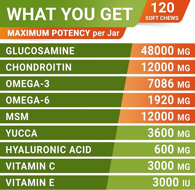 - Proven Excellence: For years, our dog glucosamine and chondroitin supplement for large dog has been advancing canine wellness. Leading as one of the best hips & joints supplements to help with joint pain relief and extend active years for old paws.