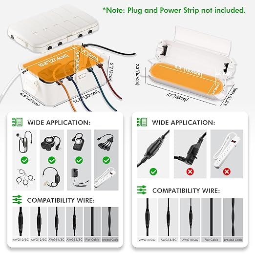- WIDE COMPATIBILITY: This outdoor electrical box dimensions are 12.5 x 8.5 x 5 inches, which can protect your power strip, timer outlet, bulky adapter and more outdoor/indoor electrical connections. The 6 cable seal ports can allow maximum 6 cords input/output. Each port is compatible with AWG12/14/16 cord, flat cable and braided wire.