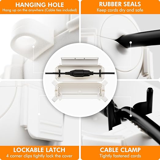 - HEAVY DUTY & WEATHERPROOF: Constructed with industrial grade material, highly durable and UV resistant, great to use in outdoor harsh environment and resist water, snow, rain, dust, dirt. Ideal to protect outdoor extension cord, LED string light, landscape lighting, pool pump, garden power tool, fountain, Christmas and other holiday decorations.