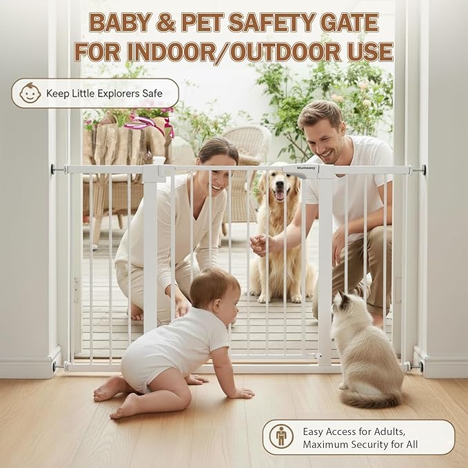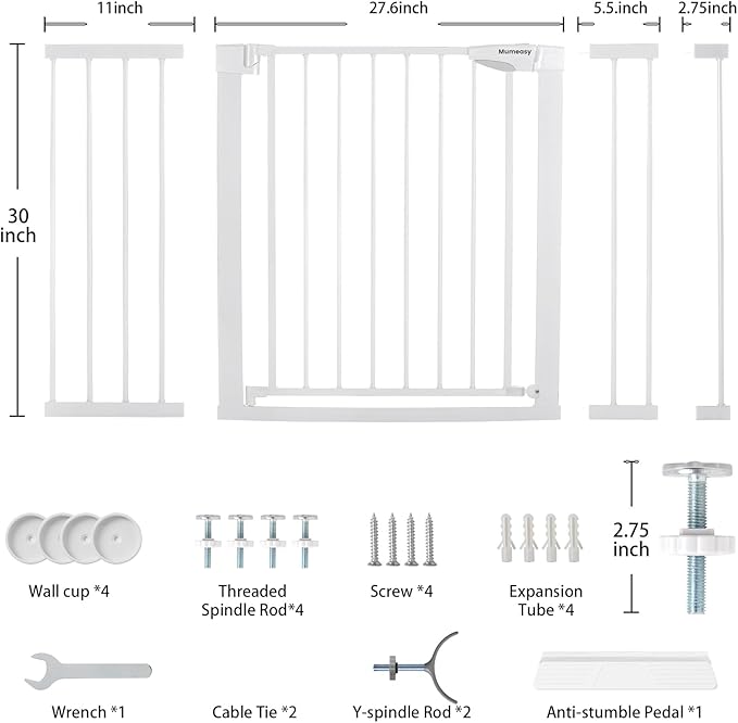 - What You Get: Mumeasy Baby gate, 1* 2.75 inch &1* 5.5 inch extension kits, welcome guide, our worry-free 18-month warranty, and friendly customer service.