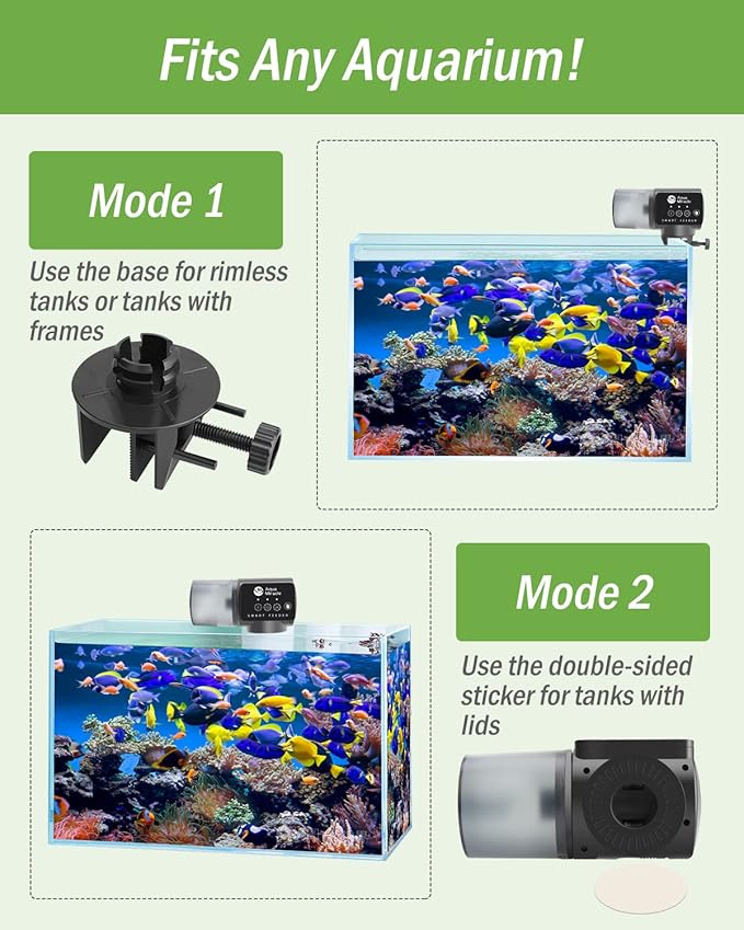 - 2 WAYS OF FIXATION FOR ANY AQUARIUM, 360 ROTATABLE – This automatic fish food dispenser fits any kind of aquarium – rimless aquariums, aquariums with frames, and aquariums with hoods. Choose the right way from the 2 fixation ways, either with a bracket or with a double-sided sticker. With the bracket this auto fish feeder is 360°rotatable for different orientation.