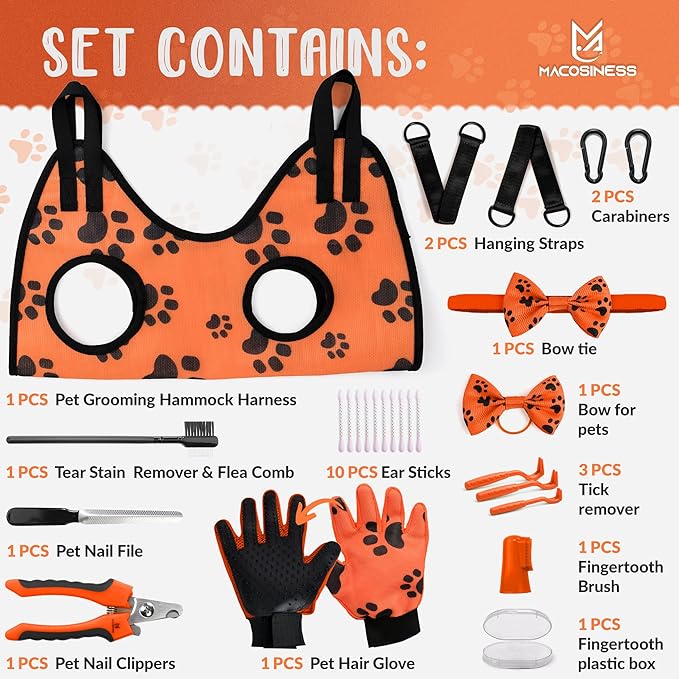 - Complete Kit: Make mani-pedi time easier for you and your dog or cat with our cat hanger to cut nails kit which including 1x grooming hammock with paws design, 1x pet glove with paws design,1x dog nail clippers with nail fail, 1x tear stain remover comb flea, 1x silicone finger tooth brush with box, 3x tick remover different sizes, 10x ear sticks, 1x bow for pets, 1x bow tie, 2x hanging straps, 2x stainless steel carabiners. Please read the size chart before purchasing;