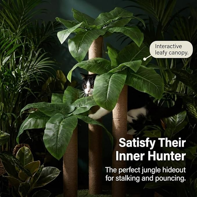 - 【Not only a cat scratching post but also a beautiful decoration】: This Cat scratching post feature 3 scratching poles covered with natural sisal and 15 pcs canna leaves on the top,carpet standing on the round base looks like a small tropical forest,which looks cute and fresh that help blend into any modern decor and add ambience.Provide cats with a more natural environment to relax and play.