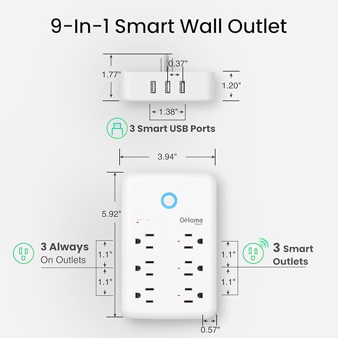 - 9-In-1 Smart Home Gadgets: The WiFi power strip includes 3 Smart Plugs ( Individual Control, up to 15A), 3 Smart USB Ports(Group Control, 5V/3A), and 3 Always-On Plug (up to 15A) to meet the needs of continuous power supply. Multi-plug design is suitable for kitchen, bedroom, office, and travel.