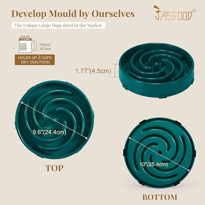 - SIZE&COLOR --- We have black,blue,pink, dark gray,purple,green,orange color for your choice. Bowl diameter(24.4cm/9.6 “), high(4.5cm/1.77 inches).This slow bowl can holds about 3 cups of dry dog food. The slow feeder dog bowl is better for small and medium dogs.