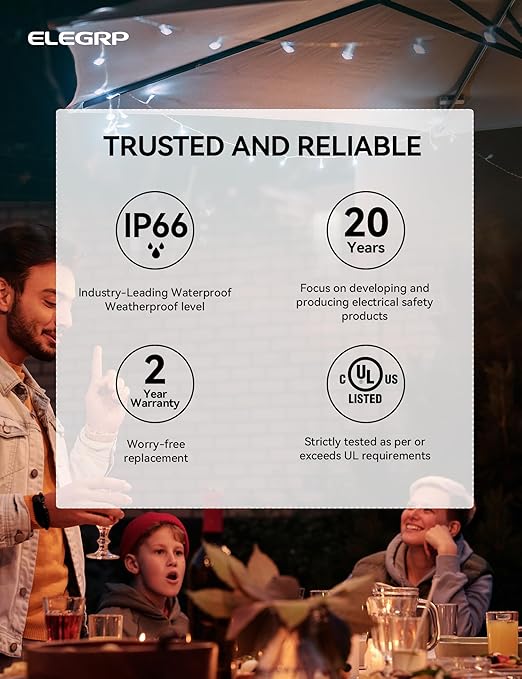 - ✅【Impressive IP66 Waterproof Rating】ELEGRP smart outdoor plug is designed with IP66 waterproof housing and cover, no more worries about short circuits in heavy rain. Built to stand the test of harsh conditions like Cold, Heat, Moisture, and UV Rays from -20°C to 50°C. Perfect for patio string lights, landscape lights, holiday lights, pond or fountain pumps, and more. UL and FCC certified to protect your family's safety.