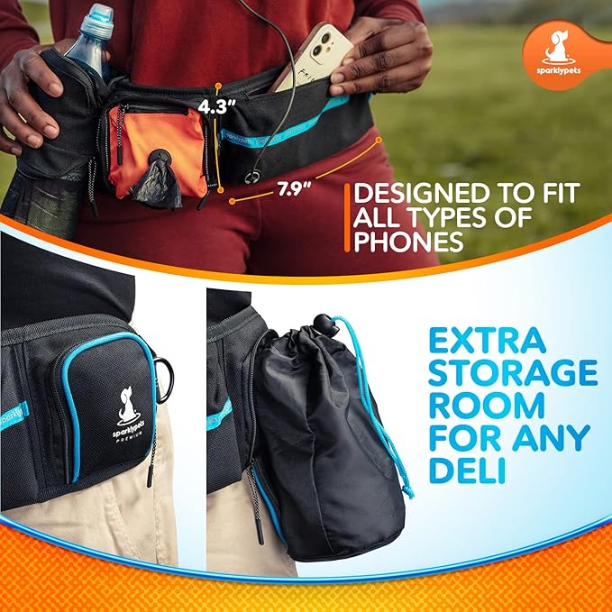 - Designed to fit all types of phones – these days, when using a dog running leash, you need to stay connected. That’s why having a phone holder with enough room is essential. Using the SparklyPets waist band dog leash, you have it all, even a dedicated dog treat pouch pocket that can easily be folded in case you don’t use it.
