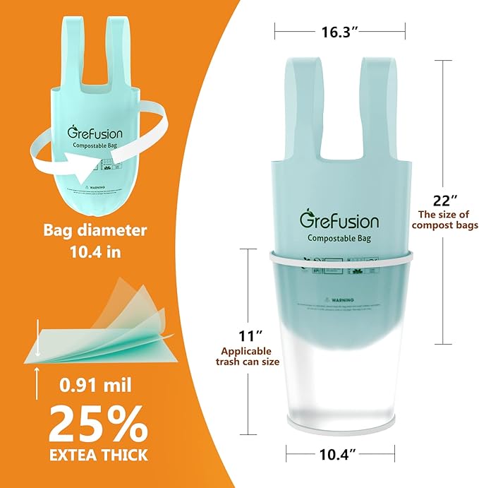 - 【STURDY COMPOST BAGS &UPDATE SUPER THICK 0.91 MIL 】We are Proud of update the design of GreFusion compost bag thick with 0.91 Mils for get carry weights up to 17.5 pounds,As kitchen trash can bags are able to withstand a heavy load of wet food waste and hot coffee grounds without any ripping.and sturdy enough with less chance of perforation by sharp leaves. keep a grefusion compost bin bags come in the home and go with confidence to stop the mess .