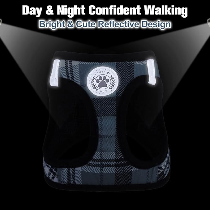 - 🐕Comfortable and Reflective ---Adjustable dog harness features colorful plaid and breathable mesh fabric, comfortable to wear and will not stick to the dog's hair. Reflective strips deign reflect ambient light in low light conditions, making you and your dog safer when walking and moving around at night without worrying about blurred vision in the dark.