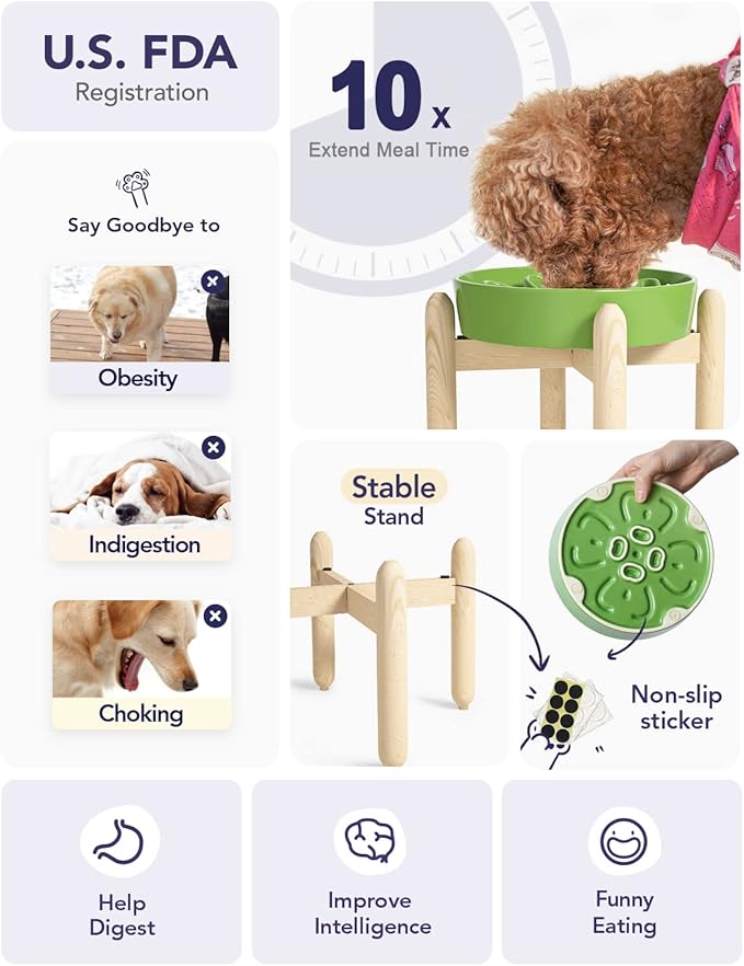 - Slow Down Eating, Bring Dog A Healthy Diet: Fast-eating dogs experience bloat, regurgitation, and obesity easily. Our slow feeder dog bowl design with the ridges and maze pattern helps your dog to eat slower than 29 times. Your dog could change his overeating behavior through a challenge and fun mealtime