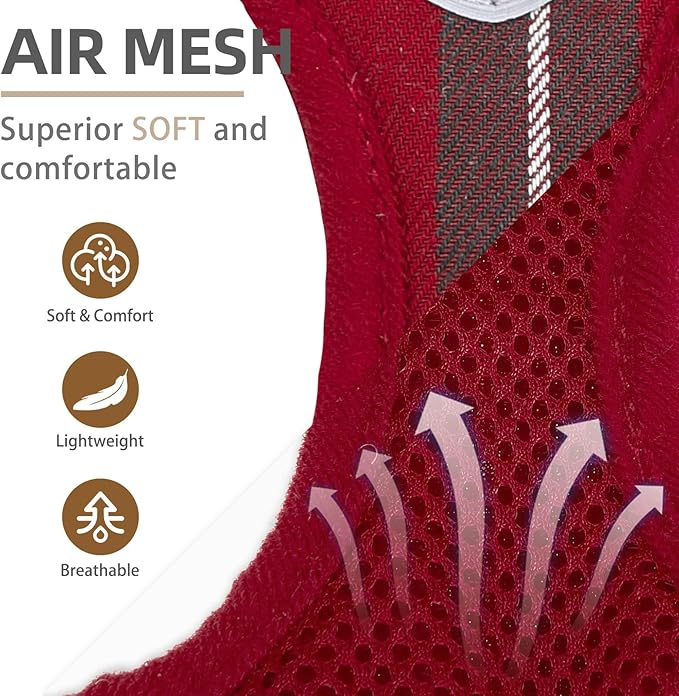 - [COMFORTABLE MATERIAL, DAILY WALKING, FOUR SEASONS WEARING] - The harness is made of durable polyester, and it's adopted with an air-mesh design. The whole harness is very soft, lightweight, and breathable. Even if your dog wears it all day, he won't feel any discomfort. For daily walking or running, it is a very easy thing to do. Besides, this is a four seasons harness, it keeps the dog cool on hot days and keeps the dog warm on cold days.