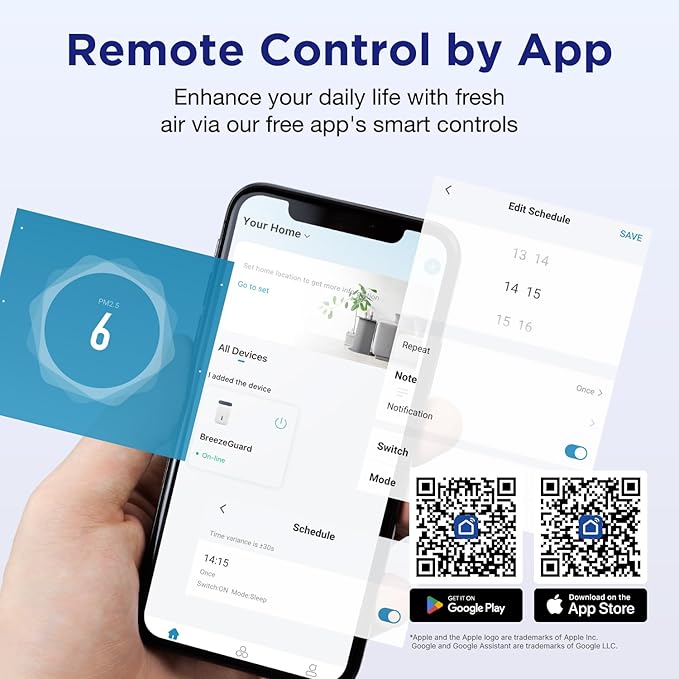 - Smart App Control: Wi-Fi enabled remote monitoring design allows you to check and adjust smart air purifier anytime, anywhere. Compatible with iOS and Android, the app provides real-time PM2.5 monitoring, scheduling, and adjustments to keep your home’s air fresh and balanced effortlessly.