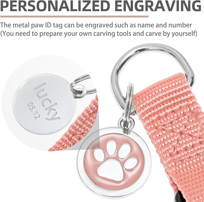 - [Cute ID Tag for DIY] - Each harness is equipped with a metal ID tag, and the front is a cute paw pattern, while on the back, you can engrave whatever you want, such as the dog's name and so on. It does not corrode as easily as wooden labels and is durable. You can also remove it when washing the harness.