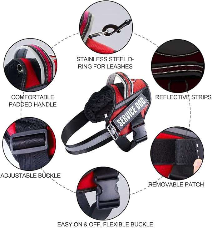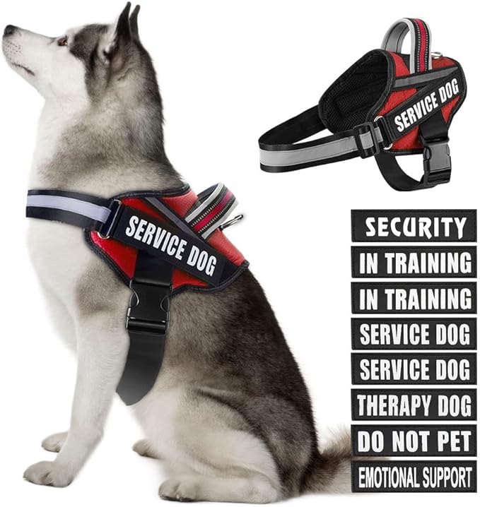 - 【WHAT WILL YOU GET】Get ready to enjoy our package, which includes a service dog harness and 10 vibrant dog patches such as "DO NOT PET," "IN TRAINING," "SECURITY," "THERAPY DOG," "SERVICE DOG," and "EMOTIONAL SUPPORT." You can attach up to 2 patches at once to reflect your dog's mood, personality, or display crucial information on your harness.