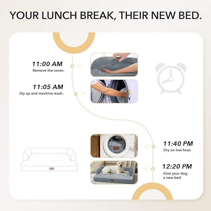 - Ultimate Easy-Clean Design: The entire cover (including bolsters) is fully removable, machine washable, and dryer-safe on low heat. It significantly reduces cleaning time, making it effortless to maintain with weekly washes. Since only the cover needs cleaning, it dries quickly and can be reinstalled promptly—keeping your dog’s bed clean and ready for use. (Tip: Remember to zip up before washing.)