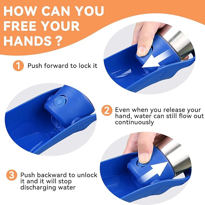 - Easy to Use & Recyclable Water: Quickly turn over the leaf-shaped dog water bowl, then press the button to allow water flow and quench your doggie's thirst. Press the button and push it forward to lock it, and the water will flow out continuously. After drinking, press the button and tilt back, excess water will flow back into the bottle. This helps reduce water waste.