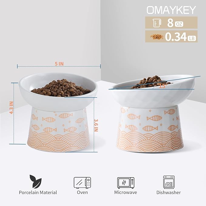 OMAYKEY Elevated Cat Bowls, 8 Oz Ceramic Raised Tilted Cat Food Water Bowl, Reduce Vomiting and Protect Pets' Spines Dishes for Cat, Small Dog and Kitten, Orange, 2 Packs