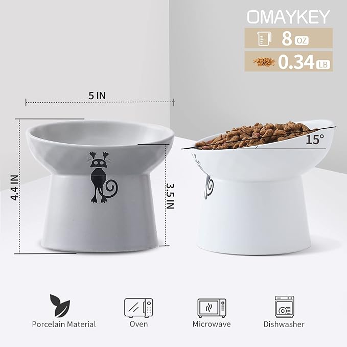OMAYKEY Ceramic Raised Cat Bowls, Tilted Elevated Cat Food Bowl Set for Cat & Small Dog, Reduce Vomiting and Protect Pets' Spines Dishes Feeder, Lead & Cadmium Free, White & Grey, Set of 2
