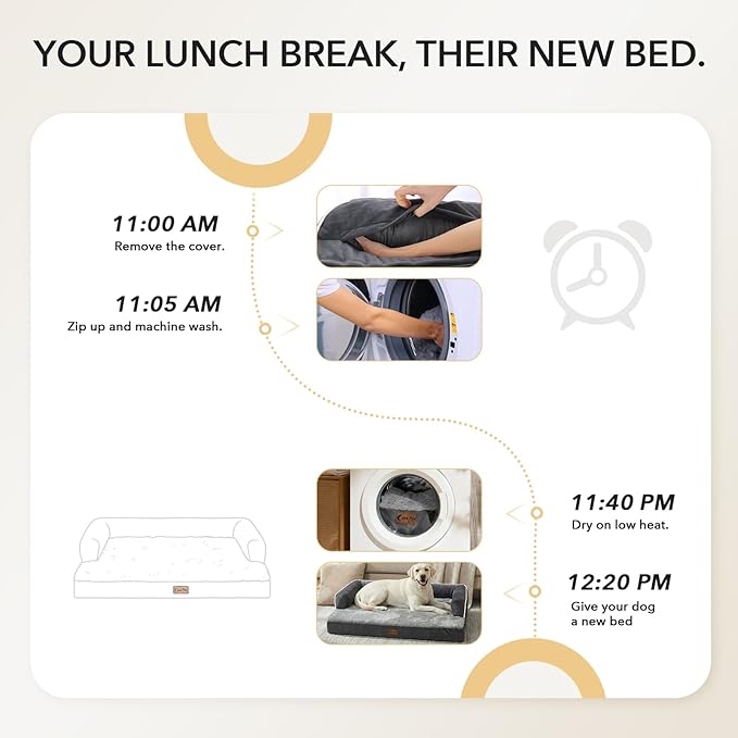 - Ultimate Easy-Clean Design: The entire cover (including bolsters) is fully removable, machine washable, and dryer-safe on low heat. It significantly reduces cleaning time, making it effortless to maintain with weekly washes. Since only the cover needs cleaning, it dries quickly and can be reinstalled promptly—keeping your dog’s bed clean and ready for use. (Tip: Remember to zip up before washing.)