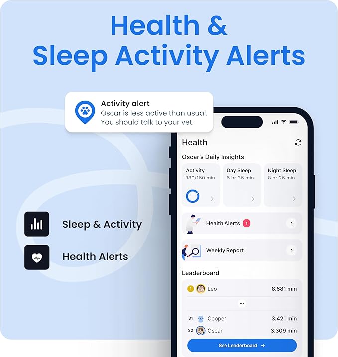 - HEALTH, SLEEP & ACTIVITY MONITORING: Stay on top of your dog’s wellness with daily insights into their sleep and activity. Get notified of unusual changes so you can act early.