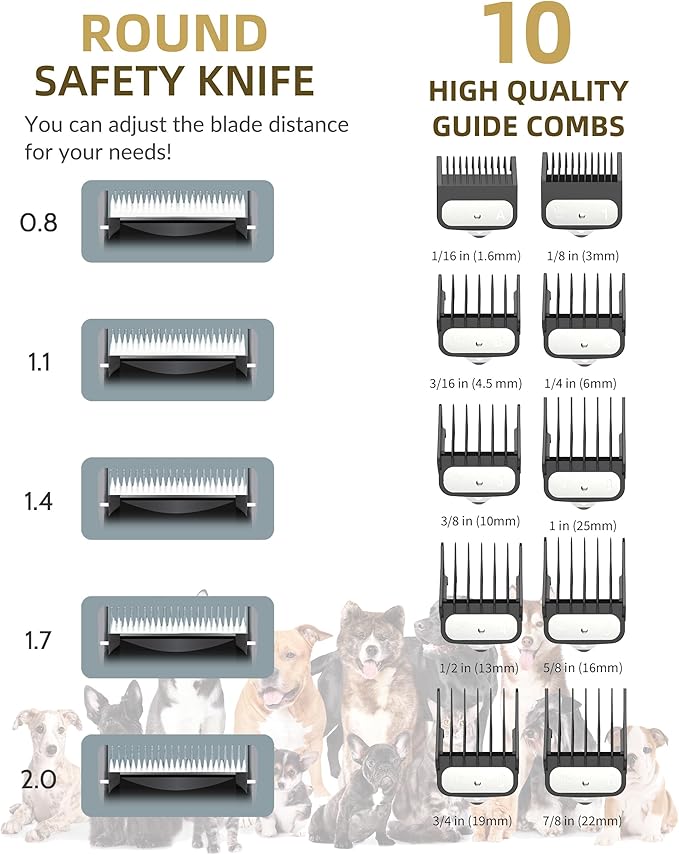 - Adjustable Clipping Length: Our dog clippers for grooming come with two adjusting modes and six guard combs that allow you to clip your pet's hair at different lengths with ease. With ten premium quality metal limit guards, you can make quick and easy length changes from 1.6 to 22mm.