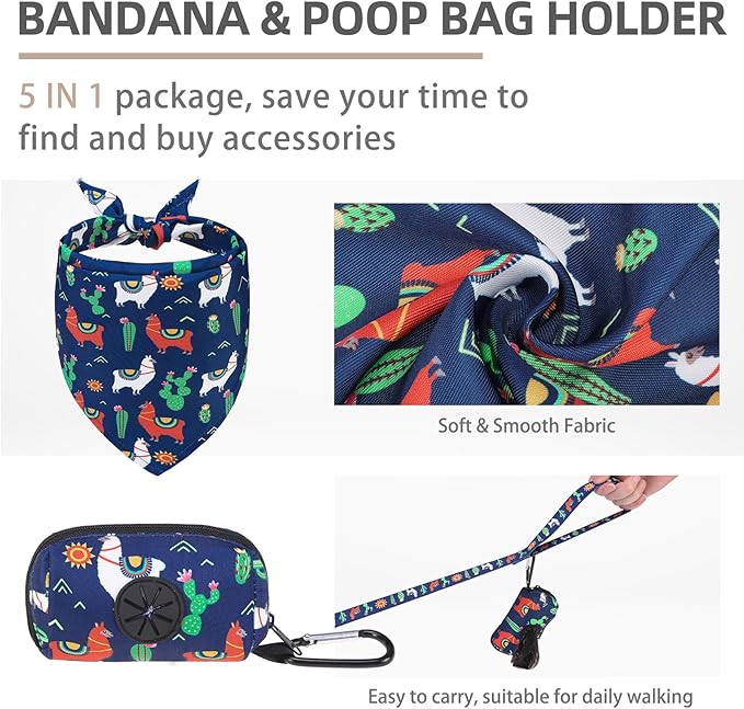 - [DOG HARNESS, COLLAR & LEASH] - The package includes three items, a walking harness, a collar, and a 4.9ft matching leash. The collar is with bell, the leash is equipped with a 360-degree rotation metal hook, and the harness is adopted with a quick-release buckle and double D-rings which are very heavy-duty. You don't need to spend extra time looking through other accessories, but you get all of these items at the same time with less money! So this is a very cost-effective set.