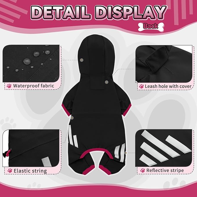 - Fashion-design - Our dog rain coats adopt four-leg design, prevent water from all directions. Hidden traction mouth makes it convenient to connect the colla and leash. Legs tail adopt elastic wrap design, neck waist are designed with drawstring for adjustment