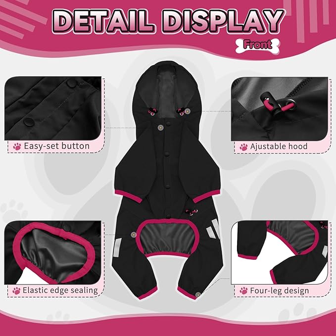 - Safe Reflective Strips - This dog rain jacket comes with reflective strips on both sides of the legs, not only add a sense of fashion to the dog raincoat, but also increase a better visibility at night, helps you quickly locate your dog.