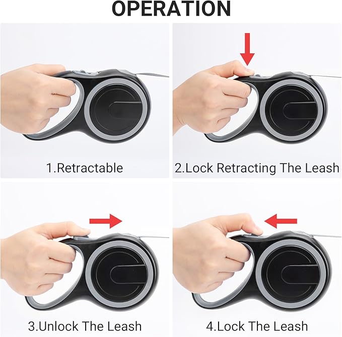 - One Button Design: Experience great convenience with our retractable dog leash's one-button brake design. You can lock and release the leash with just one hand, making it easy to adjust the length as needed. The intuitive button placement ensures quick and precise control, allowing you to keep your pet close when necessary or grant them more freedom when appropriate. Our xxx makes every walk a breeze for both you and your furry companion.
