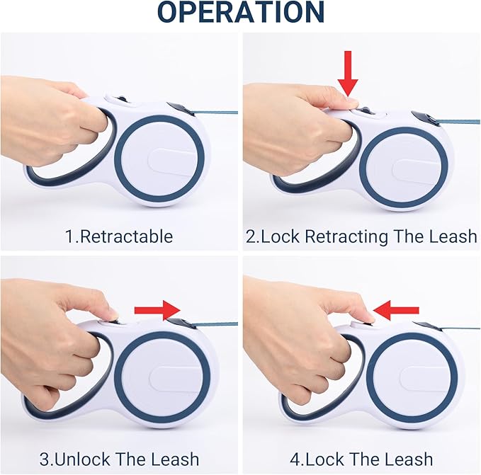 - One Button Design: Experience great convenience with our retractable dog leash's one-button brake design. You can lock and release the leash with just one hand, making it easy to adjust the length as needed. The intuitive button placement ensures quick and precise control, allowing you to keep your pet close when necessary or grant them more freedom when appropriate. Our xxx makes every walk a breeze for both you and your furry companion.