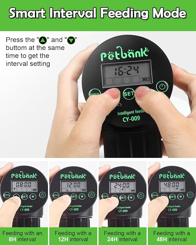 - Smart Interval Mode: Easily set the feeding intervals by pressing the "▲" or "▼" button. Choose from 8 hours, 12 hours, 24 hours, or 48 hours to automatically spin the feeder once for each feeding cycle