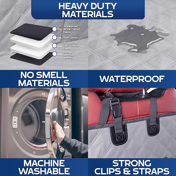 - WATERPROOF, HEAVY DUTY MATERIALS, EZ CLEANING - Shield your truck's interior with our 100% waterproof back seat pet cover for dogs truck. Designed to repel water and resist scratches, it's the ultimate defense against dirt and hair. Our dog car seat cover for back seat keeps your truck looking brand new, no matter where the road takes you. Machine washable on gentle, and hang dry for easy cleaning!