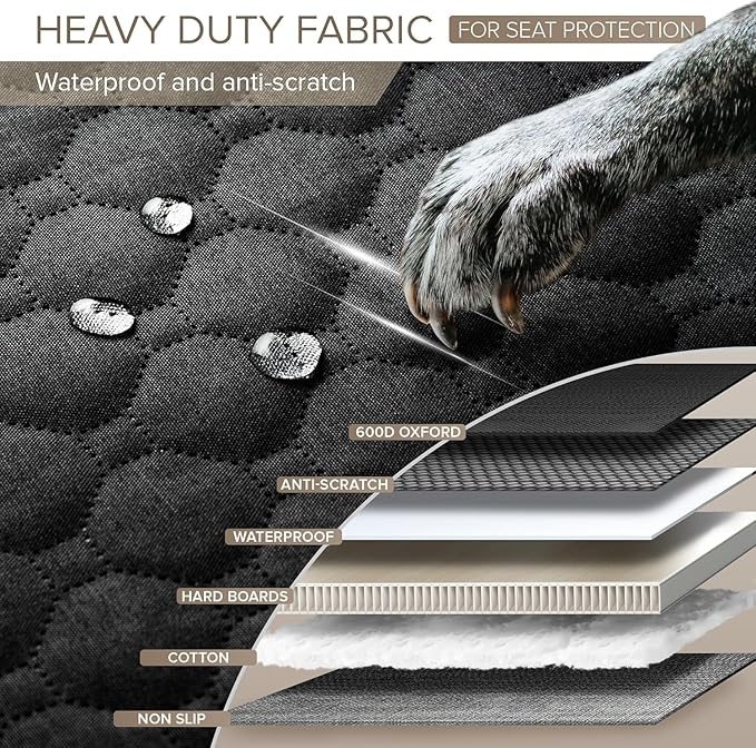 - HEAVY DUTY DOG CAR BED TO ALL-ROUND PROTECTION - The waterproof back seat cover made of 6-layer fabrics, including strong 600D Oxford, dog car seat cover hard bottom and special fabric for scratch-resistant, safeguarding car seats from wear, water and stains. Backseat cover for dogs in car with extra higher door protector avoid doors from scratches and damage. Let dogs hop in and out the dog hammock bed with joy, while car seat covers for dogs takes care of preserving your car perfectly