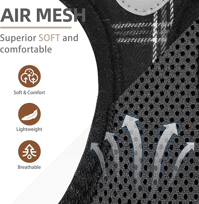 - [COMFORTABLE MATERIAL, DAILY WALKING, FOUR SEASONS WEARING] - The harness is made of durable polyester, and it's adopted with an air-mesh design. The whole harness is very soft, lightweight, and breathable. Even if your dog wears it all day, he won't feel any discomfort. For daily walking or running, it is a very easy thing to do. Besides, this is a four seasons harness, it keeps the dog cool on hot days and keeps the dog warm on cold days.