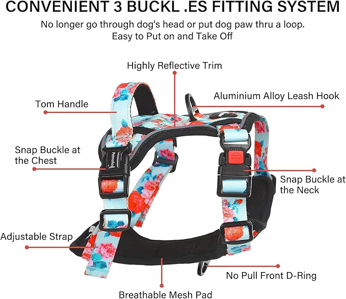 - [Easy to Put on and Take Off] Petmolic no pull dog harness has 3 closures - 1 around the neck with a red security lock and 2 on each side of chest girth for ease of taking off and putting on. No longer have to go through dogs head and put dog paw thru a loop. Just put the logo side on the dog back, buckle it up with front legs on each side, adjust the straps, and here you go! It may take awhile to get adjusted properly first time, but once done, it is fairly easy to put on and off.