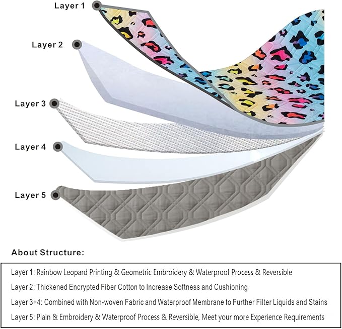 - The Rainbow Leopard Printed Pet Bed Blankets is Made of 5 Layers of High-density Composite Materials. The Surface + Bottom are Geometric Embroidered + Color Matching Printed with Leopard Printed + Water Resistant + Reversible + Reusable + Brushed. It NotOnly has a Three-Dimensional Luxury Visual Enjoyment, But Also Doubles the Prevention of Liquid Stains. Leakage, Feel Upgraded to be More Comfortable and Fit.