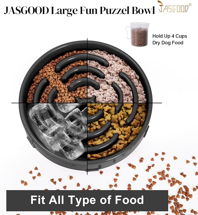 - Slow Down Eating & HEALTHY DIET: JASGOOD slow feeder dog bowl is design for large dog. It promotes healthy eating and can help our pets no more gobbling food down. The unique maze design allow dogs to chew food more slowly and reduce digestive,vomiting problems, enhancing oral sensation and the fun of eating. The mould is develop by ourselves and it’s special in the market.