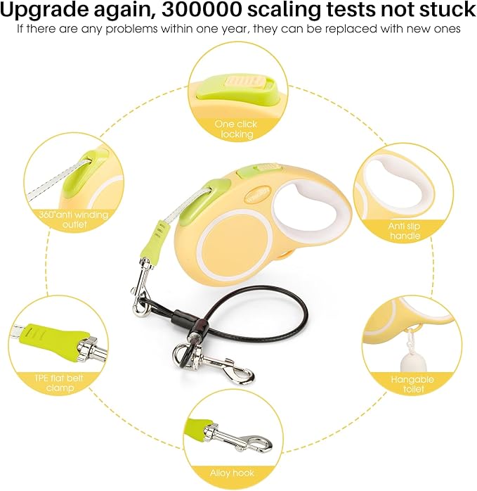 Upgraded Retractable Dog Leash with Chew Proof Cable and Poop Bag Dispenser, 16Ft Heavy Duty Dog Leash for Small Medium Large Dogs up to 120lbs, 360° No Tangle (Yellow)