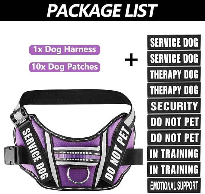 - 【WHAT WILL YOU GET】Get ready to enjoy our package, which includes a service dog harness and 10 vibrant dog patches such as "DO NOT PET," "IN TRAINING," "SECURITY," "THERAPY DOG," "SERVICE DOG," and "EMOTIONAL SUPPORT." You can attach up to 2 patches at once to reflect your dog's mood, personality, or display crucial information on your harness.