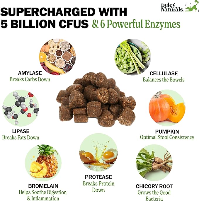 Deley Naturals Probiotics Plus Chews for Dogs, Gut Health Supplement, 5 Billion CFU's, Digestive Enzymes, Prebiotics, Dog Allergies, Diarrhea, Yeast, Pumpkin Flavor, 90 Count - Made in The USA