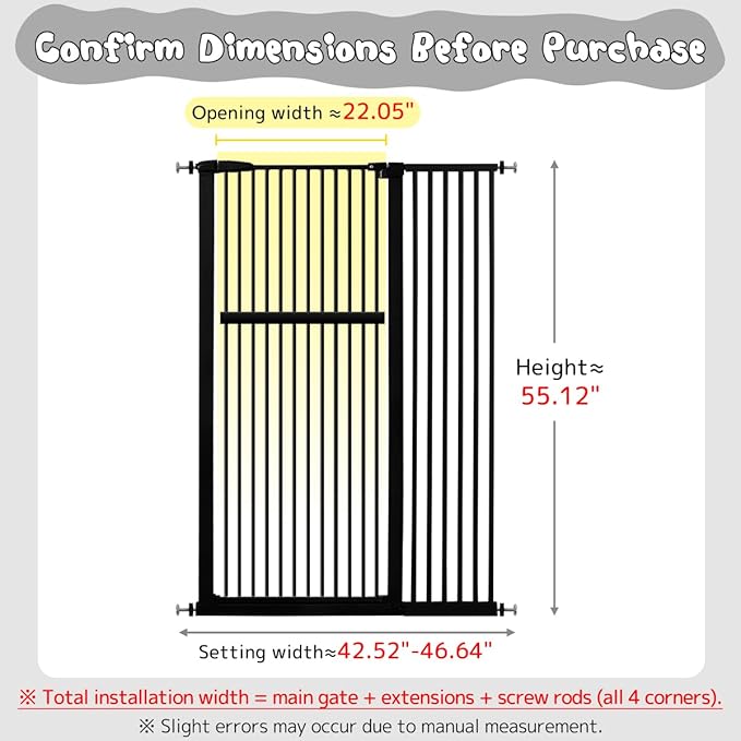 - 【Auto-Close Function & Adjustable Width】 The auto-close feature automatically shuts the gate if the angle is less than 90°, reducing the risk of accidentally leaving it open. When opened to a 90° angle, the gate stays open, allowing for easy access. The adjustable width makes it perfect as an extra tall dog gate or tall pet gate in various spaces. Its dual mounted option also provides added stability for larger openings or extra long spaces.