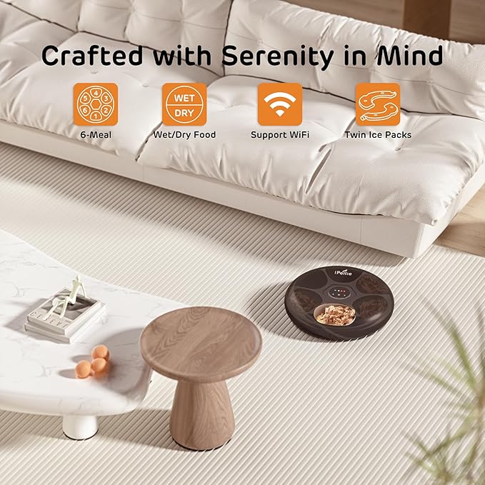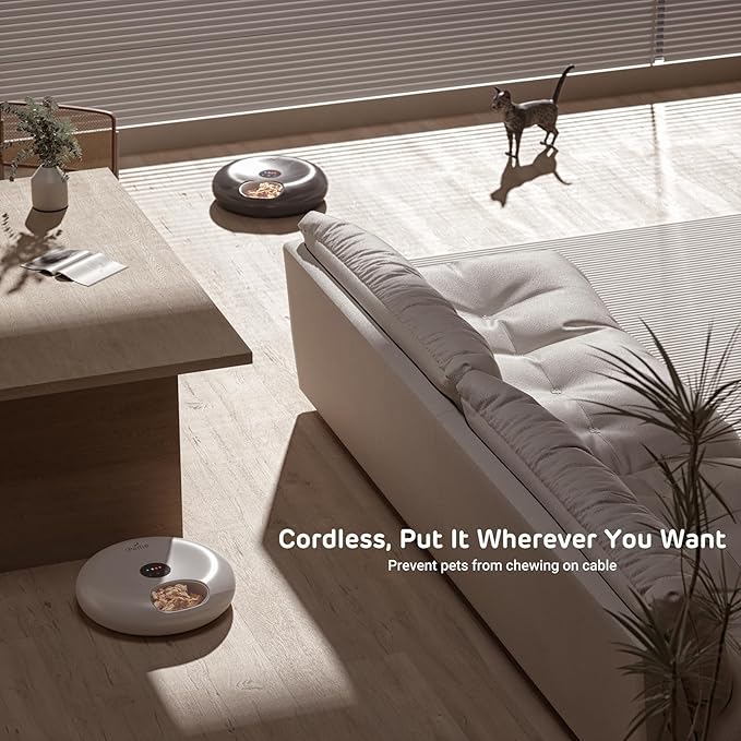 - WiFi App Control: Use the smart control app to feed your pets anytime, anywhere. Schedule up to 6 meals a day or customize it for 2 meals a day for 3 days, or 1 meal a day for up to 6 days. Track feeding records and share the device with multiple accounts (2.4GHz network only).