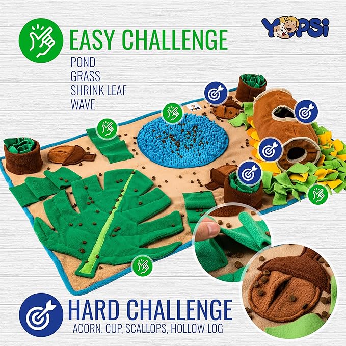 - Various Levels of Dog Enrichment and Mental stimulation: The dog foraging mat provides a range of puzzles with different levels of difficulty, suitable for dogs of various dog games experience
